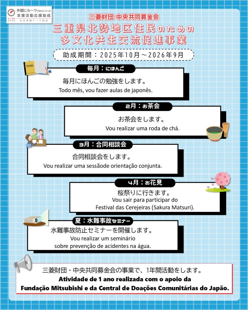 この度、当団体の取り組みが、三菱財団・中央共同募金会による 「第6回 三重県北勢地区住民のための多文化共生交流促進事業」 に採択され、助成金を受けることになりました。